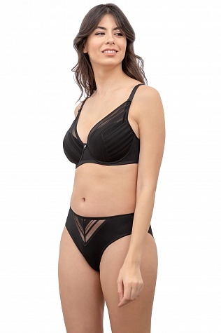 Бюстгальтер дублированный на стане, на каркасах. Чашки декорированы эластичным кружевом в полоску. Передняя и боковые детали стана из эластичного полотна укреплены монокапроном. В боковых швах упругие пластины. Стан сзади из эластичной сетки. Регулируемые бретели «anti-slip» сзади с декоративным V-элементом.Декор: хромированная фурнитура и бренд-подвеска
