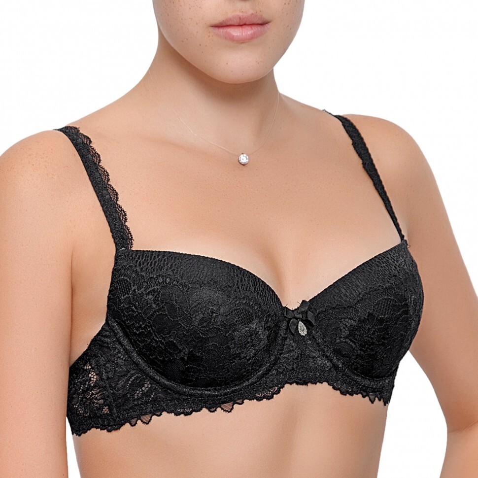 Бюстгальтер балконет с формованной чашкой Push-up. Чашка Allonge. Придает груди дополнительный объем, центрует и приподнимает ее. Внутренняя поверхность чашек - хлопок. Бретель несъемная. Декор бантик с подвеской.