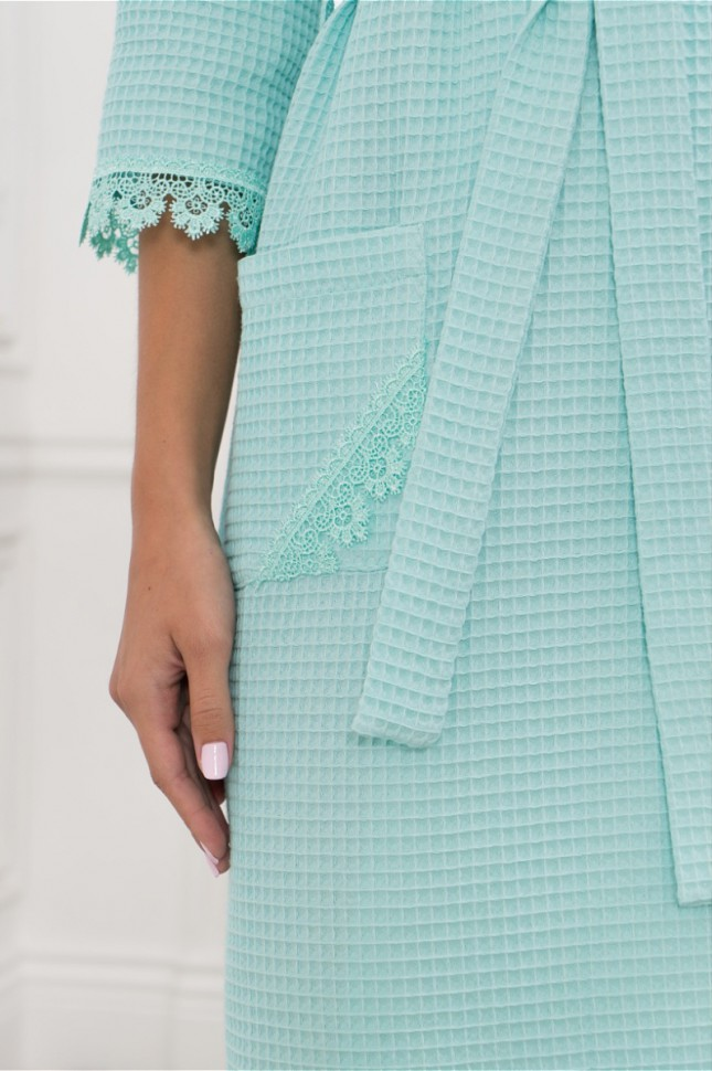 Вафельный халат молочного цвета полуприлегающего силуэта, с запахом, длина до уровня линии колена. Рукава халата длиной 3/4, одношовные, прямые. На срезы горловины халата и борта правой полочки настрочено кружево. Полочки халата цельнокроеные. На правой полочке настрочен накладной карман. Отделкой служит кружево, настроченное на нижний угол кармана. Функцию застёжки халата выполняет обтачной пояс, продёрнутый в шлёвки по боковым швам, а также полодержатели. На левой полочке, выше уровня линии груди прикреплена термоклеевая аппликация из стразов - Cleo.