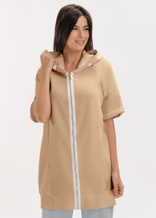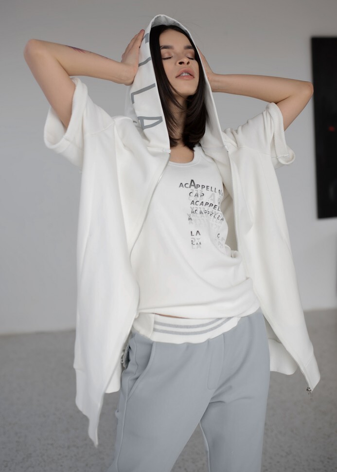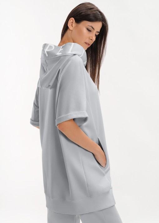 Удлиненный худи из ткани «футер пенье 3-х нитка» на молнии. Короткий рукав реглан. Карманы в рельефе. Стилизованный принт на капюшоне.