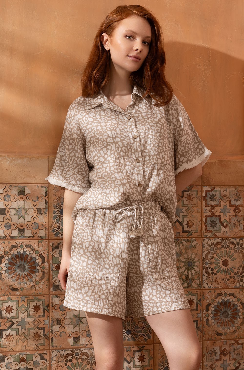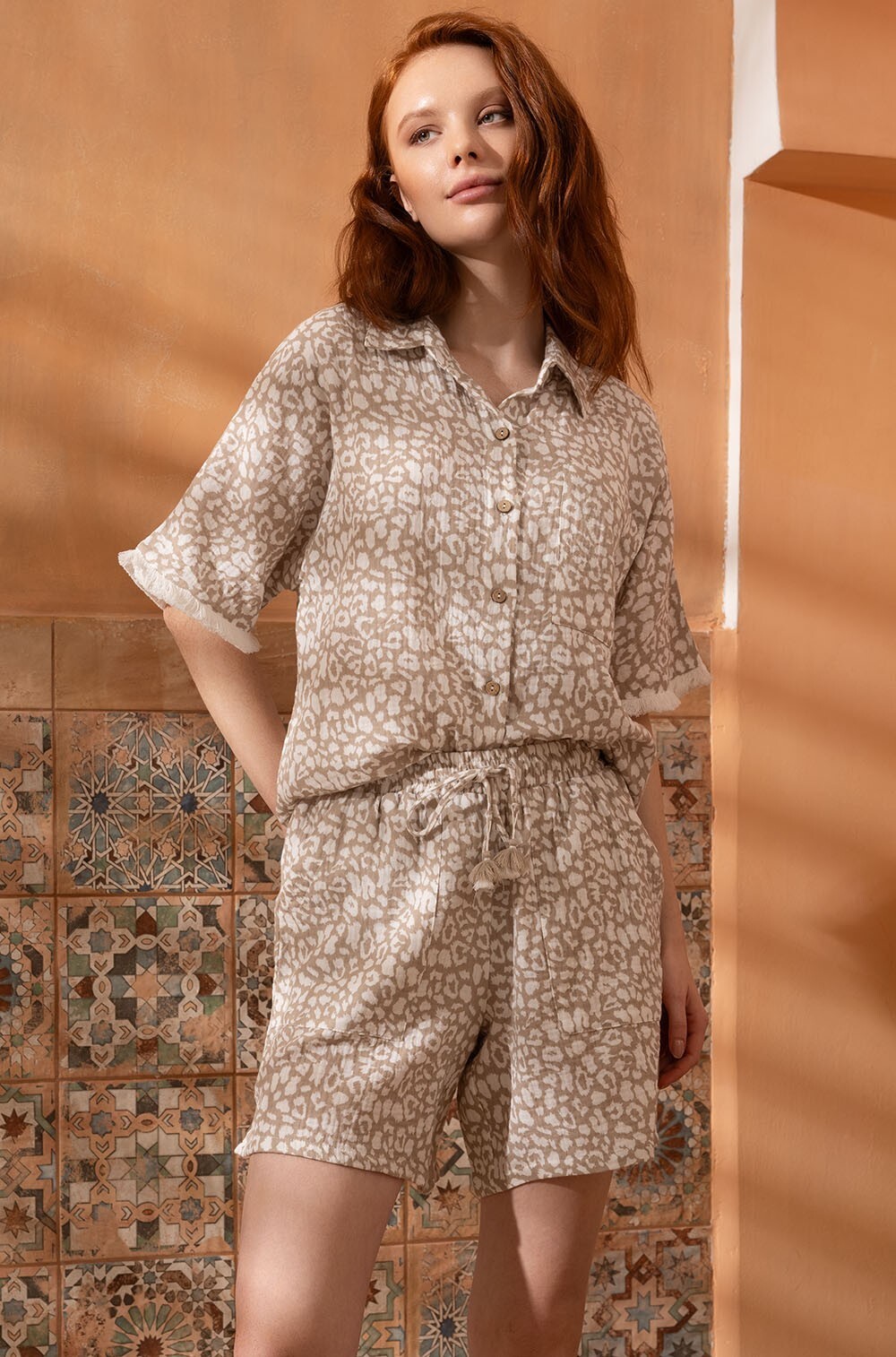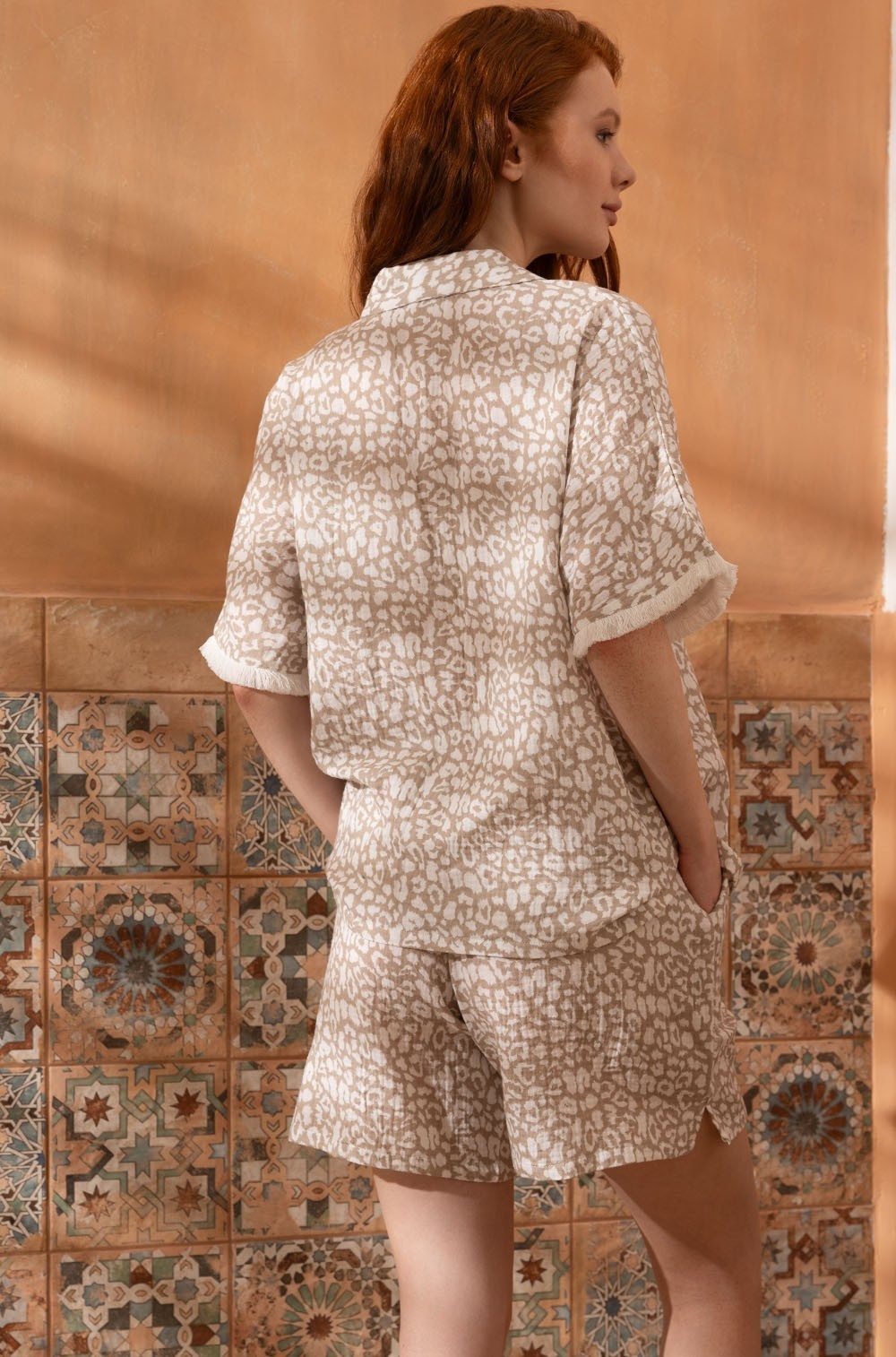 Комплект 5414 Camila от Mia-Amore состоит из рубашки свободного силуэта с цельнокроеным коротким рукавом, низ которого декорирован бахромой и свободных удлиненных шорт. На левой стороне рубашки расположен накладной карман. В шортах по бокам обработаны карманы, а по низу разрезы для свободы движения. Изделие выполнено из принтованного муслина.