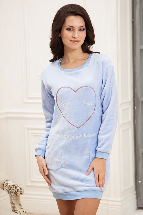 Домашнее женское платье из гладкокрашеного ворсового трикотажного полотна велсофта. Платье свободного силуэта, выше уровня колена с карманами в боковых швах.