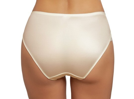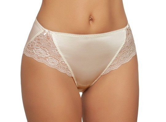 Трусы-слип комфорт с завышенной линией талии. Выполнены из микрофибры с блеском и эластичного кружева. Приоткрывают линию бедра, подчеркивая ее изгиб. Трусы хорошо фиксируются на теле, поддерживая область живота. Украшение: атласный бантик.