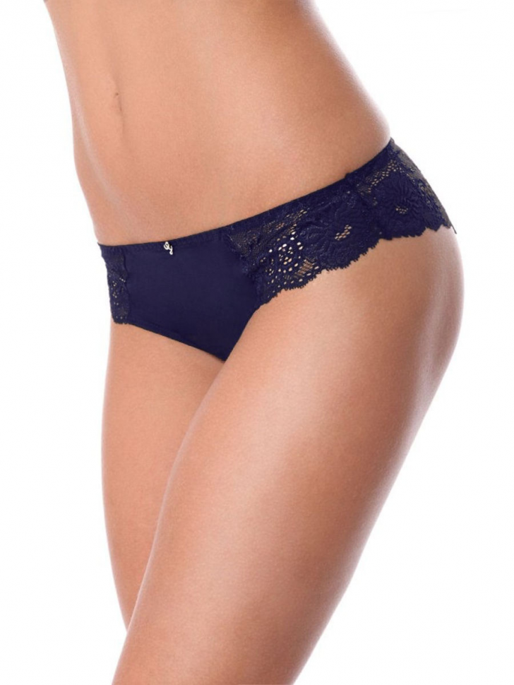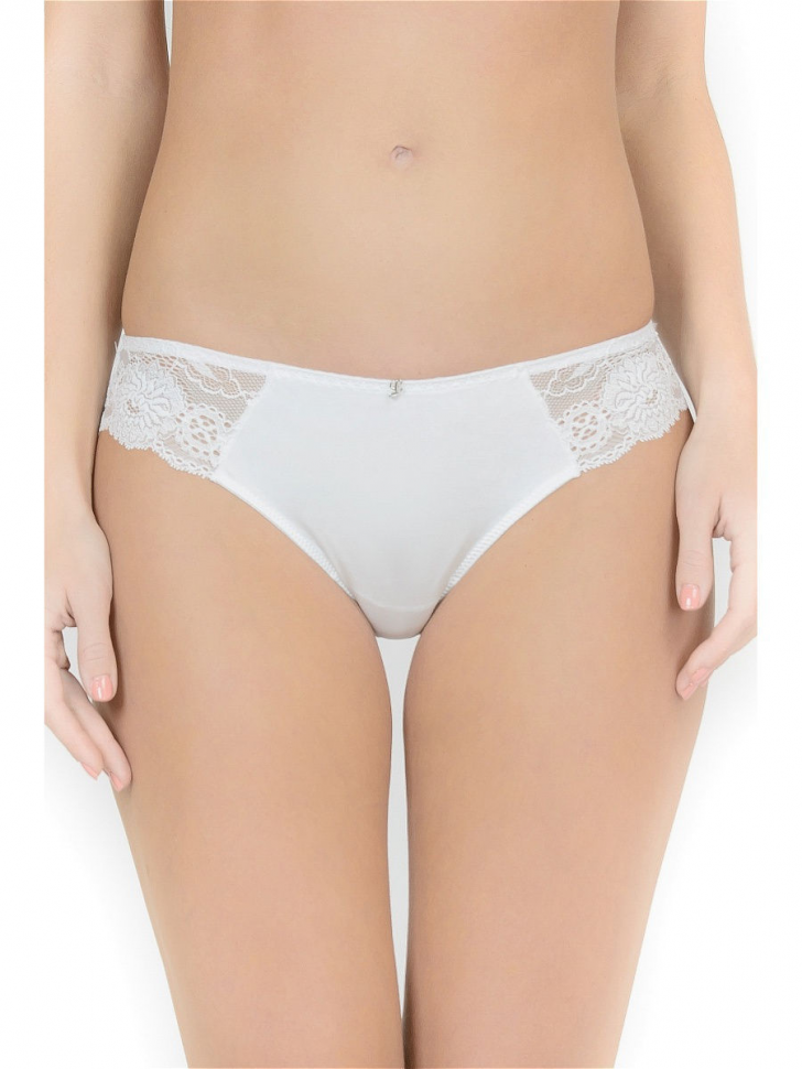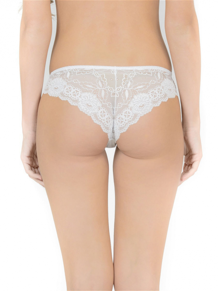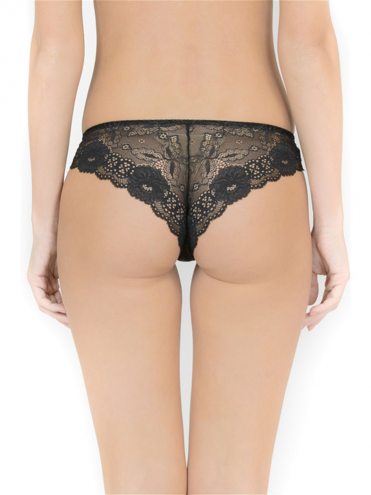 Трусы бразилиана со средней линией талии. Выполнены из эластичной мягкой микрофибры с эффектом блеска и кружева с растительным орнаментом плетения.