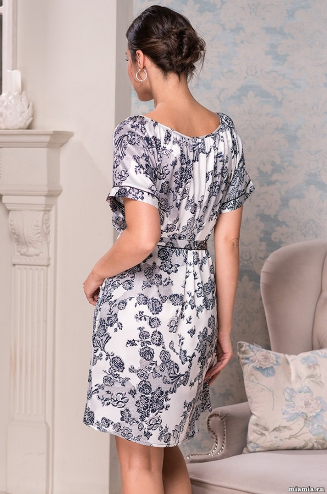 Короткая туника Mia-Mella с цельнокроеными спущенными кроткими рукавами выполнена из принтованного искусственного шелка. Вырез горловины и низ рукавов декорированы контрастным кантом. В боковых швах расположены карманы. Туника регулируется по талии поясом с кисточками.